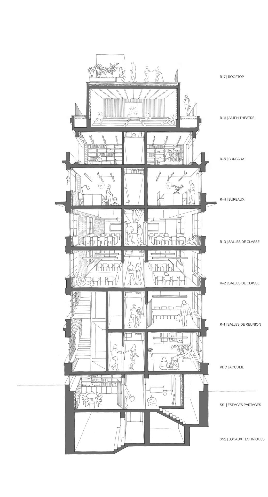 Transformer l’existant est un défi à la fois spatial, programmatique et technique. En tant qu’architectes, nous sommes sollicités pour le surmonter afin de réenchanter les qualités du bâtiment initial. L’aménagement intérieur est pensé de manière habile pour offrir un plan libre, une déambulation fluide entre les étages et une terrasse panoramique dominant les plus beaux monuments de la capitale.